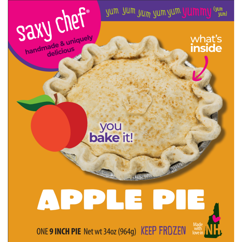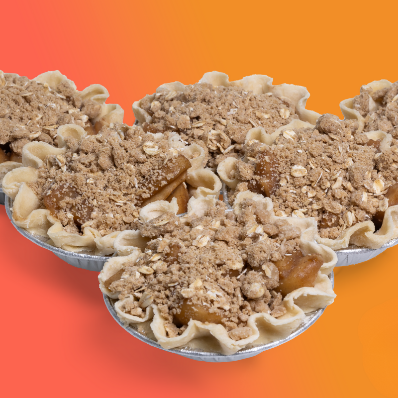 9" frozen, double crust, labelled for retail sale, or bake and sell by the slice. 4" tiny pies are single crust with crumb topping, not labelled for retail sale. Bake from frozen. The OG! Fresh apples, lemon, the perfect amount of cinnamon, nutmeg & allspice.